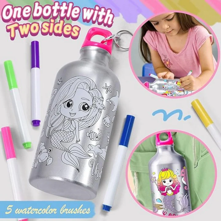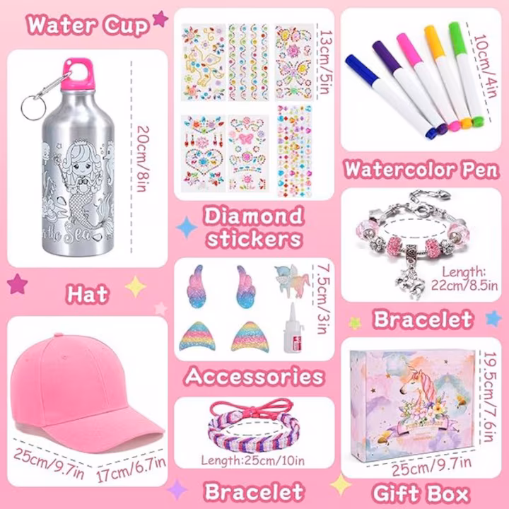 - 【Set de arta si mestesuguri creative】Inclusiv o sticla de apa cu graffiti sirena, 1 sapca de baseball roz, 5 pixuri de acuarela, 1 accesoriu unicorn, 1 accesoriu aripa, 2 urechi curcubeu, 7 autocolante cu diamante, 1 bratara impletita, 1 bratara Pandora si 20 ml de alcool lipici.