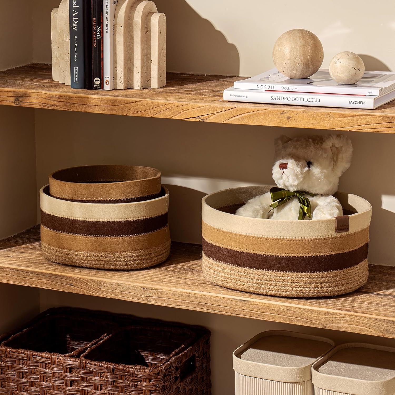 - COSURI DE DEPOZITARE VERSATILITATE din pasla – Fabricate manual din pasla reciclata de inalta densitate si iuta naturala extrasa din scoarta plantei de iuta alba, rezultand o textura moale si durabila. Acest set unic de cosuri combina iuta naturala cu benzi de pasla colorate intr-un model mozaic, facandu-l o piesa eleganta pentru orice camera din casa ta.