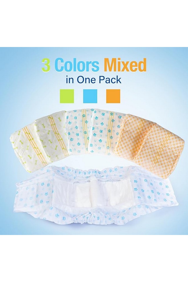 Există 3 culori scutece pentru animale de companie pentru câini masculi în pachet cu modele diferite în aceeași dimensiune.